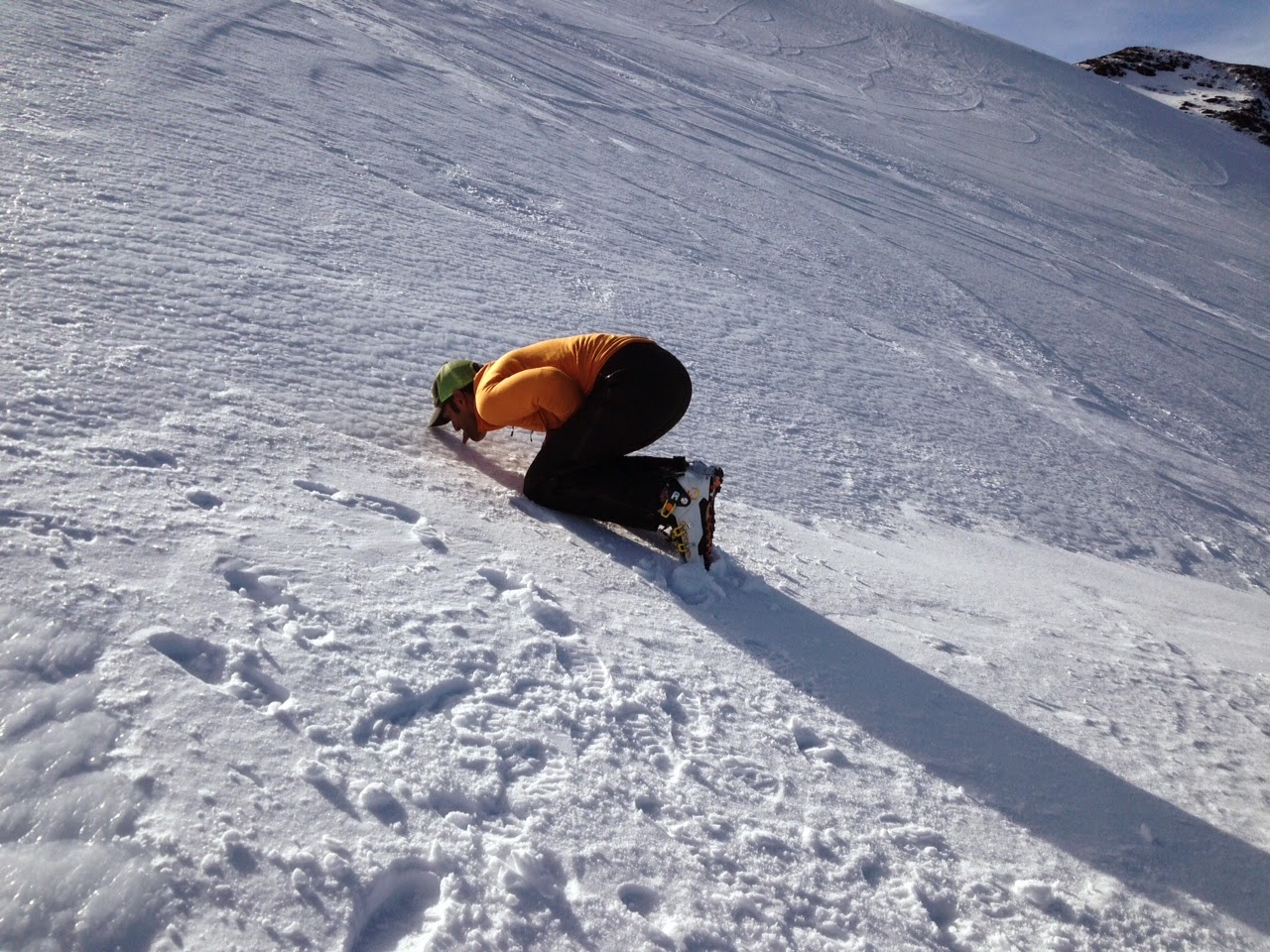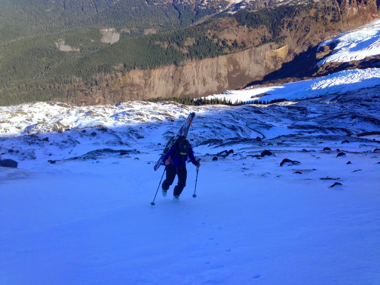 Some context: Our day was…icy. A big surprise to me, as I had spent the previous weekend skiing fresh powder on the same line. I posted this original trip report to the forum Turns All Year – used primarily by backcountry skiers, so the language below is a little more technical than you might be used to seeing from me. For additional aid in your understanding, a weather window implies calm conditions in between storms, a high freezing level indicates softer snow conditions down low, and a whippet is (not a dog breed as my just-now Google search would imply, but in fact ) a ski-pole with a sharp end you can use to hault your downward progress in the event of a fall.