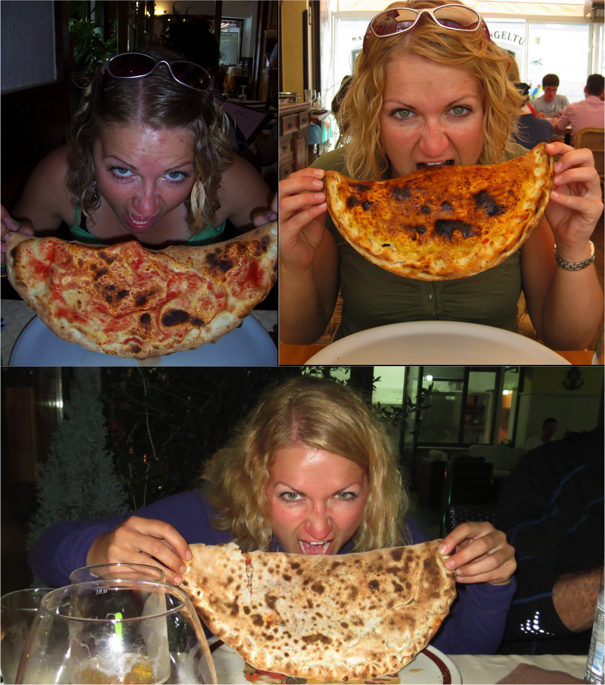 And finally, in keeping with more tradition, I ate an emergency-siesta-inducing calzone bigger than my face. I am both proud and ashamed of the below photo montage.