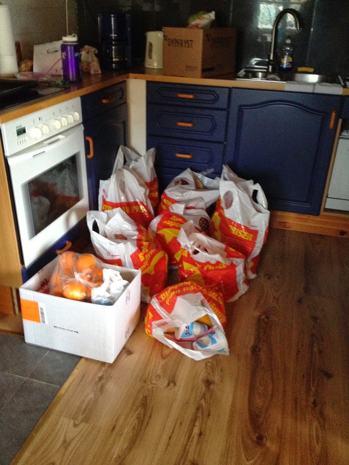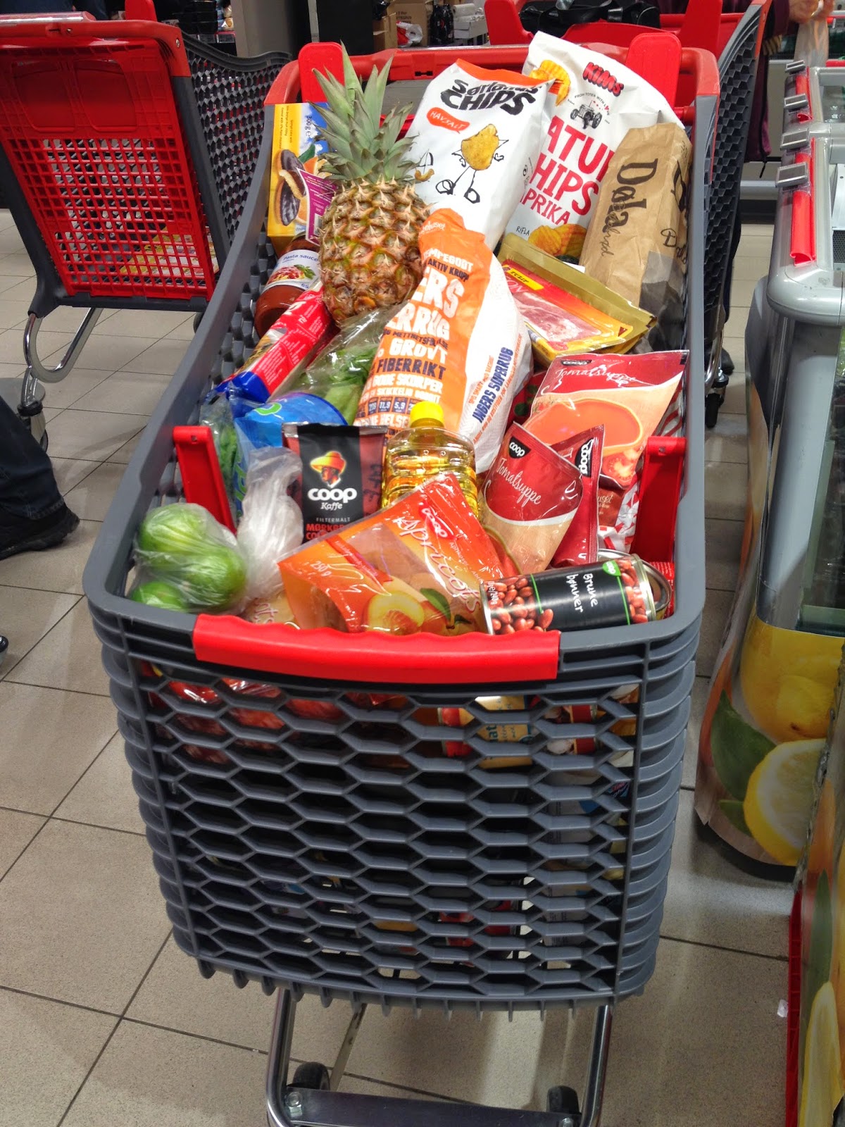 For their part, the Norwegian checkout people seemed pretty non-plussed by our MASSIVE cart. It took one person unloading the cart and three people bagging (and loading into multiple carts) for us to get out of there. The final bill?….