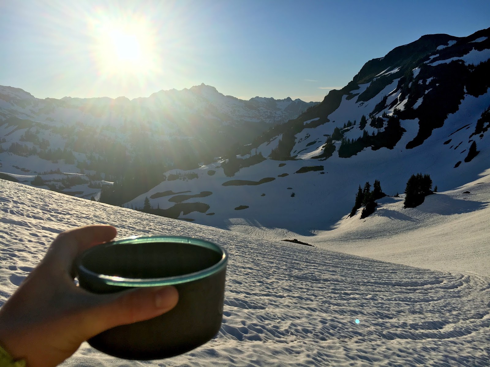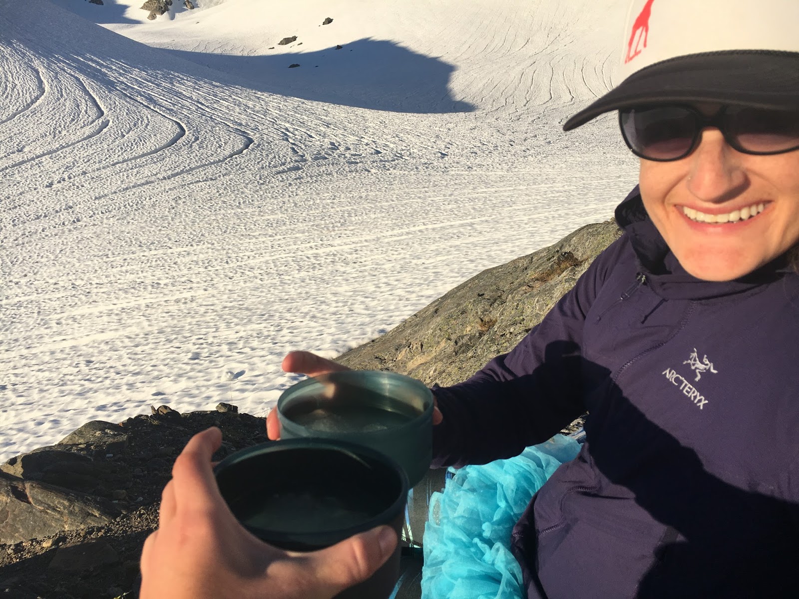 My hands are burning from the cold. I’m squeezing fistfulls of snow into small ice balls to put in our cups, and I think I’ve hit the threshold of effective hand-warmth-to-ice-creation-ability ratio. After 11 hours on my feet with a 46lb pack, I have high expectations for this drink.