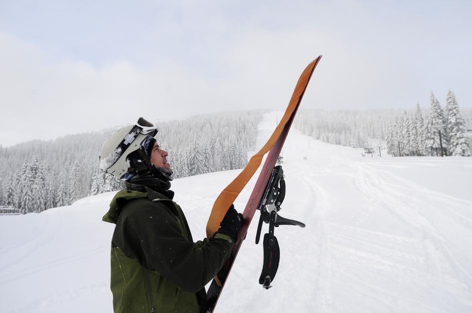 Now that you have the basics, how do you get uphill? Well you certainly don’t boot pack (that would be ridiculous). Enter: Skins! Skins provide friction for you on the way up, gripping the snow so you don’t slide backwards. Skins are the length of the ski, super adhesive on one side, and have hair on the other side. The hair feels just like horse hair (only plastic), soft when you rub it one way, and prickly/friction-providing when you rub the other way.