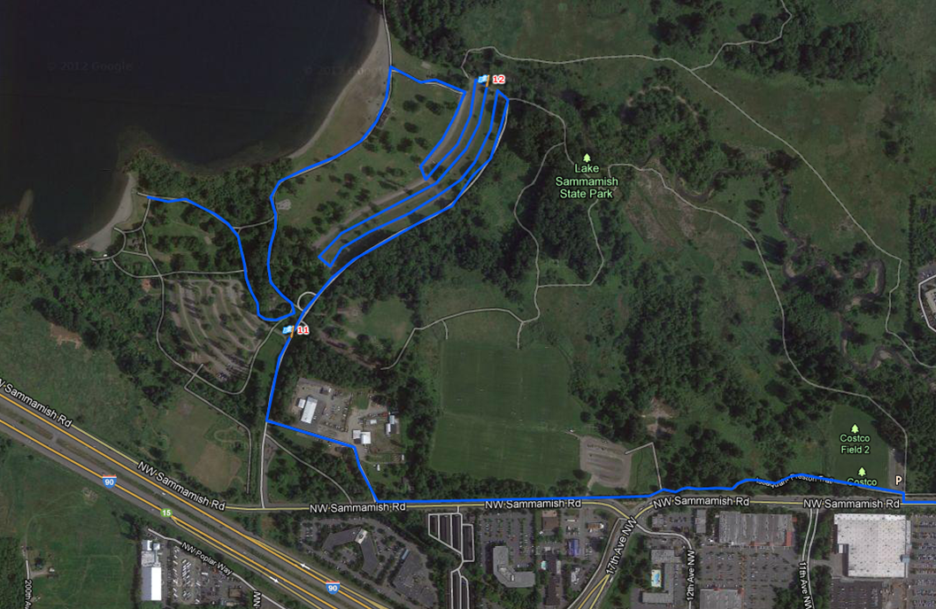 The course would have been beautiful, if we had been able to see through the fog. The race began right next to the climbing area at Marymoore Park and meandered along Lake Sammamish Trail for 12 miles before ending with just-plain-MEAN switchbacks through Lake Sammamish State Park. When the lake did peek out through the clouds towards the end of the run, the scenery really was enchanting.