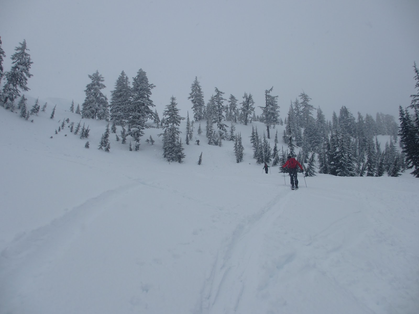 We skinned up through the trees and worked our way around avy debris to the top of the mountain. It was about 3,000 feet to the top and took a little over an hour. Wish I could say we had a nice view 🙁