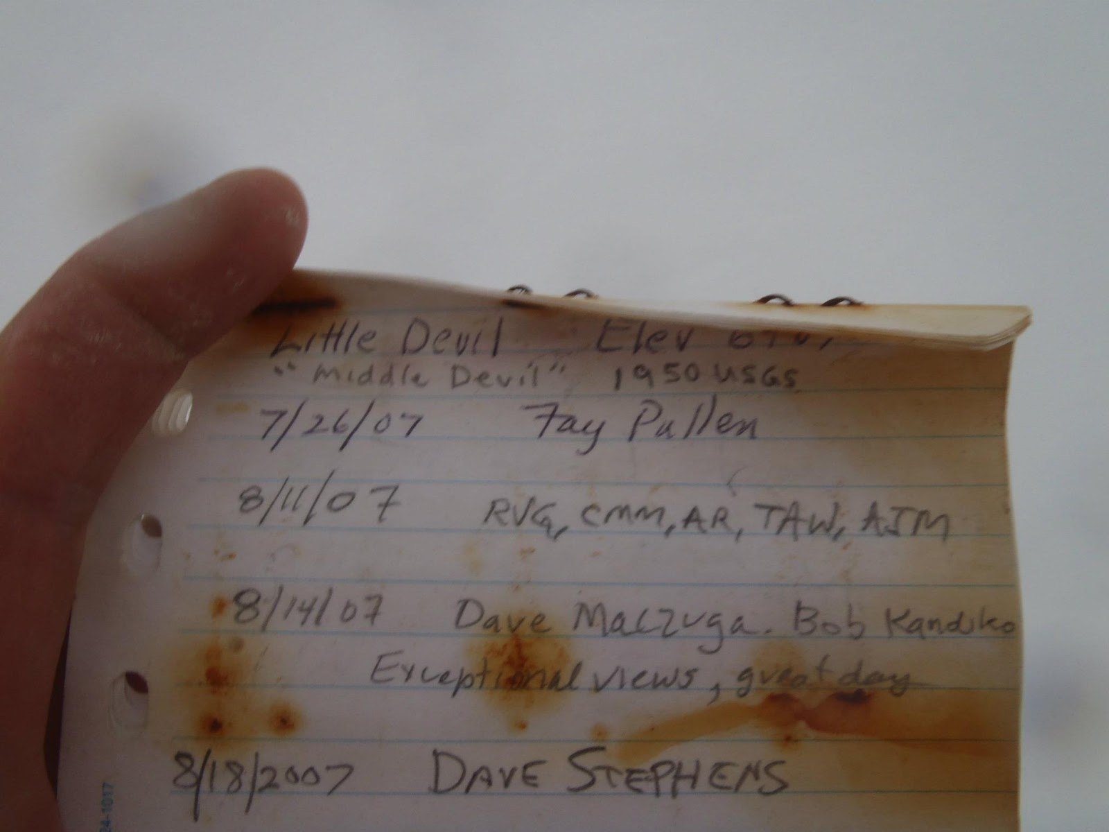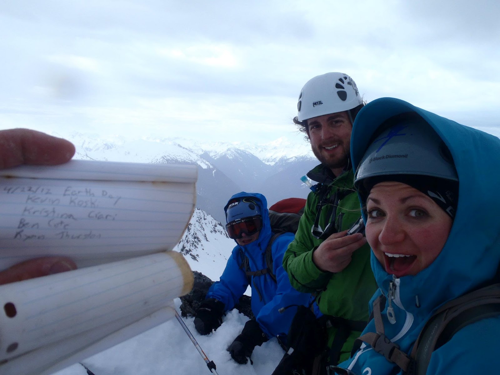 In total, it took about another hour from where we skied down to get to the summit. In keeping with Cascade weather traditions, the conditions that met us on the summit were rainy, windy, and generally unpleasant. Kevin stood on Little Devi first (he certainly earned it!) and he was able to find the register placed there in 2007 by Fay Pullen, a local area legend known for being the first person to stand atop the summit of most of Washington’s more obscure peaks.