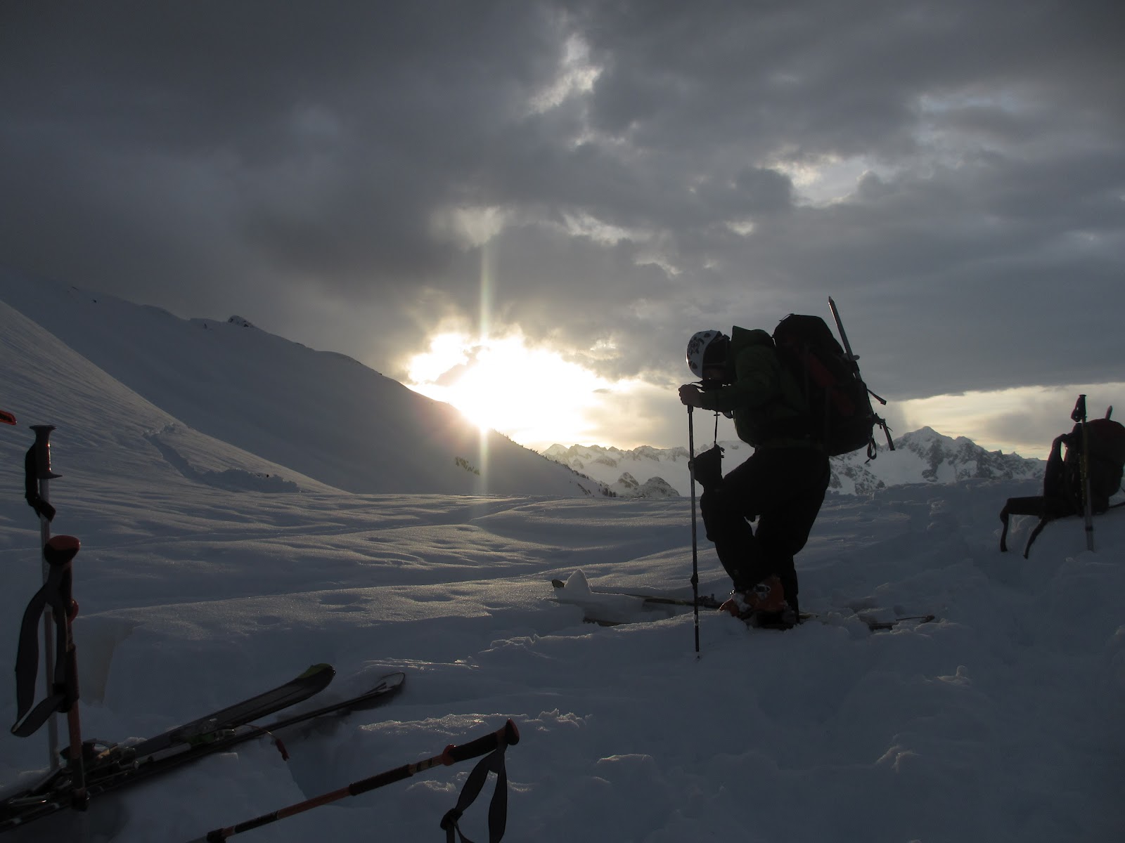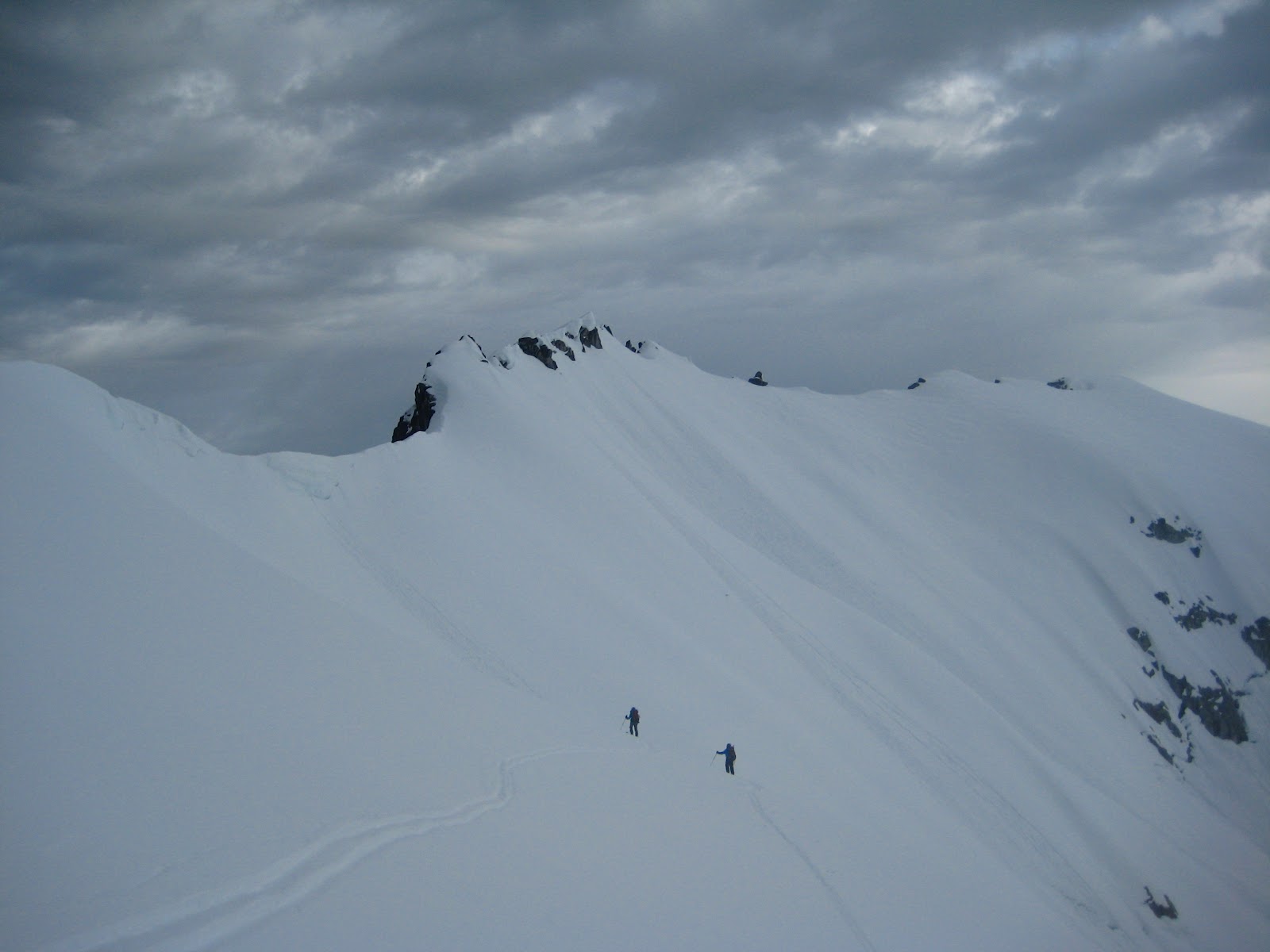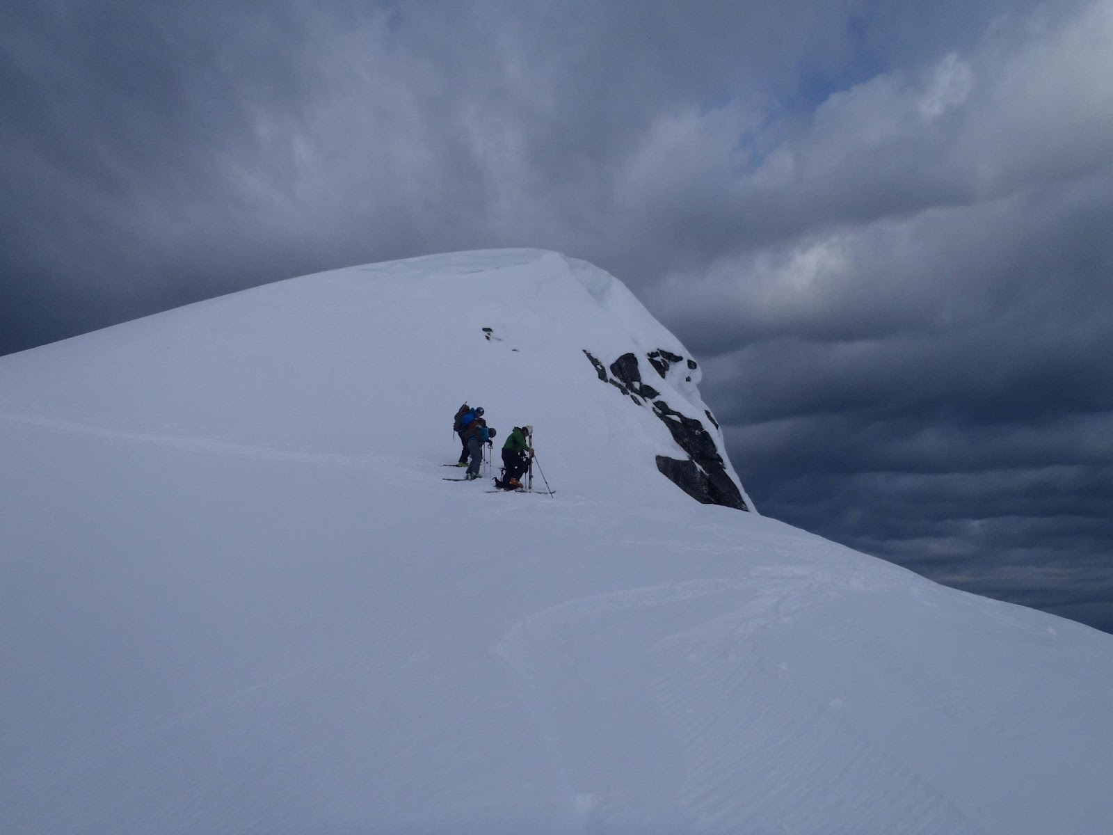 Even though the weather didn’t require it, we were all still thankful to Kevin for putting in the skin tracks the previous evening! It made for some fast skinning, and we were across the long ridge in a mere 30 minutes.