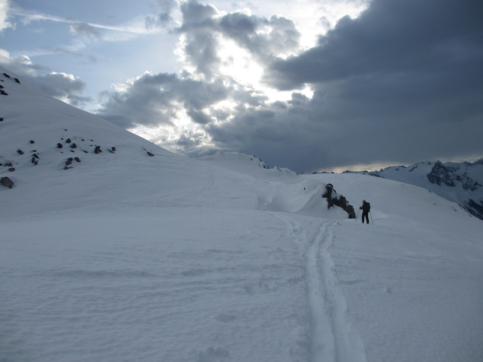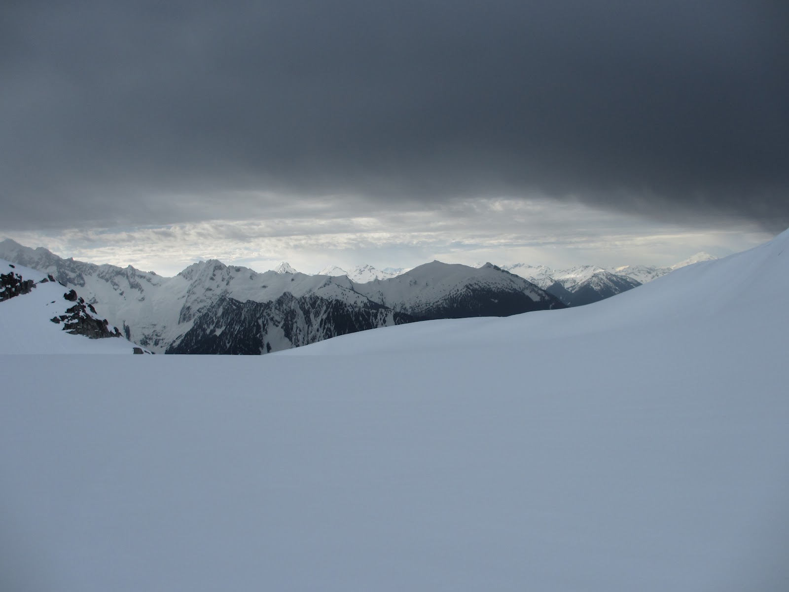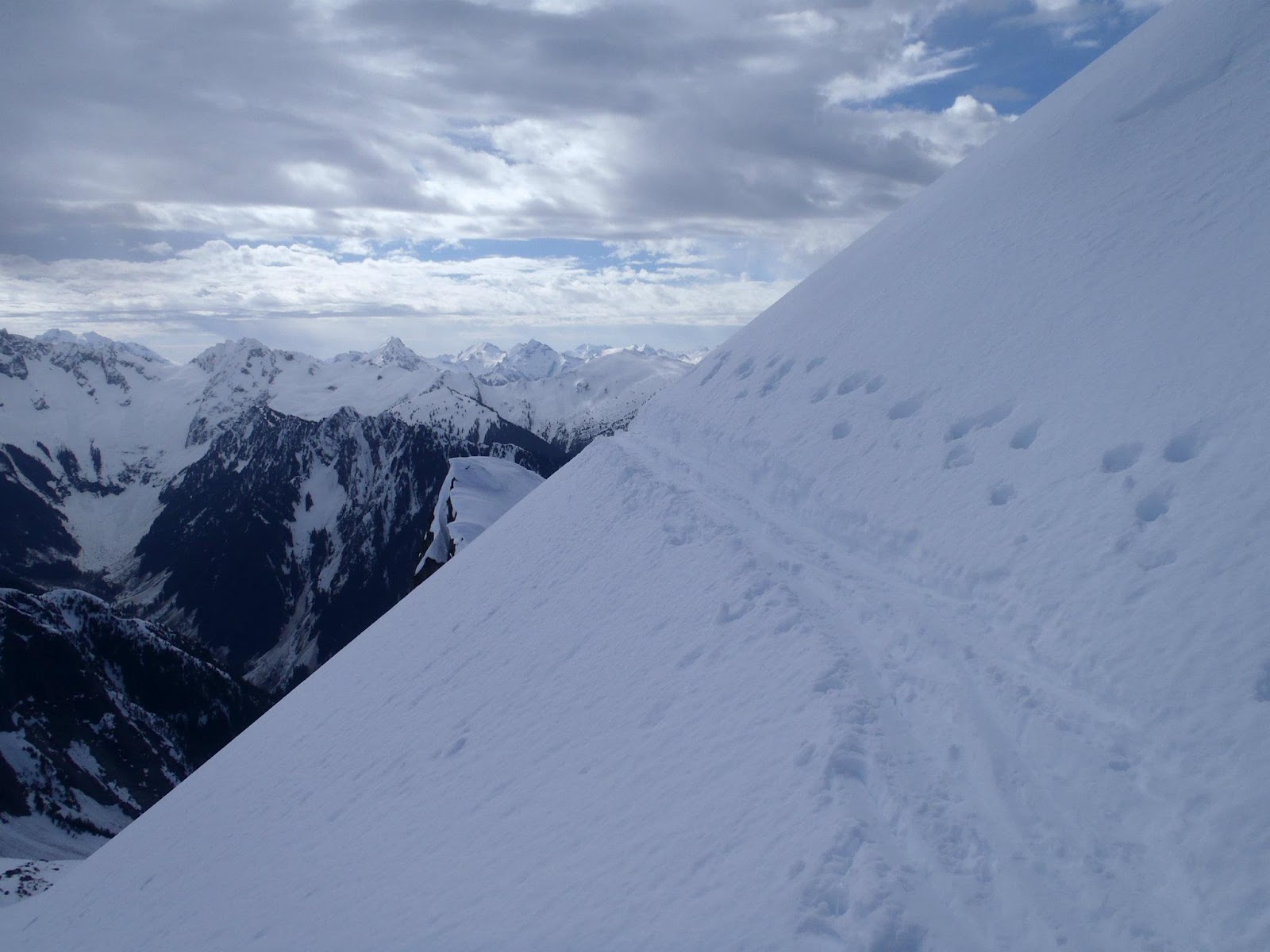 Even though the weather didn’t require it, we were all still thankful to Kevin for putting in the skin tracks the previous evening! It made for some fast skinning, and we were across the long ridge in a mere 30 minutes.
