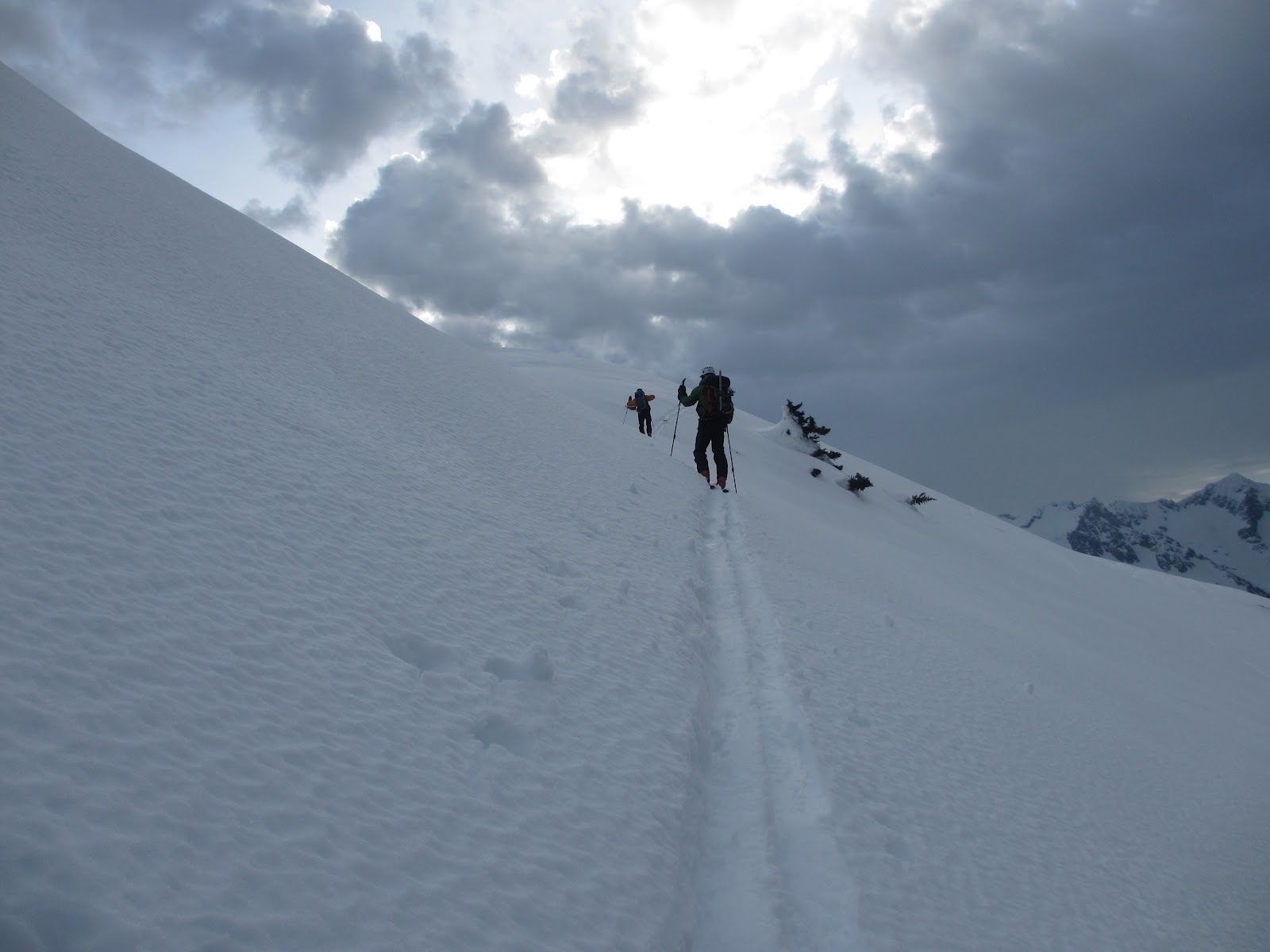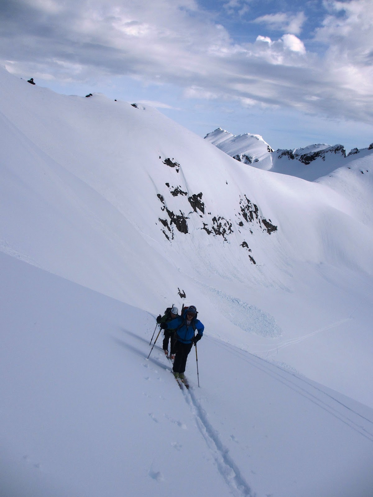 To get to Little Devil, we needed to pull off our skins and made some turns down an open bowl before skinning back up and traversing to begin the climb to the summit. We discussed avalanche conditions, as the temperatures were warming, but it was still before 8am, so we chose to keep going… speedily.
