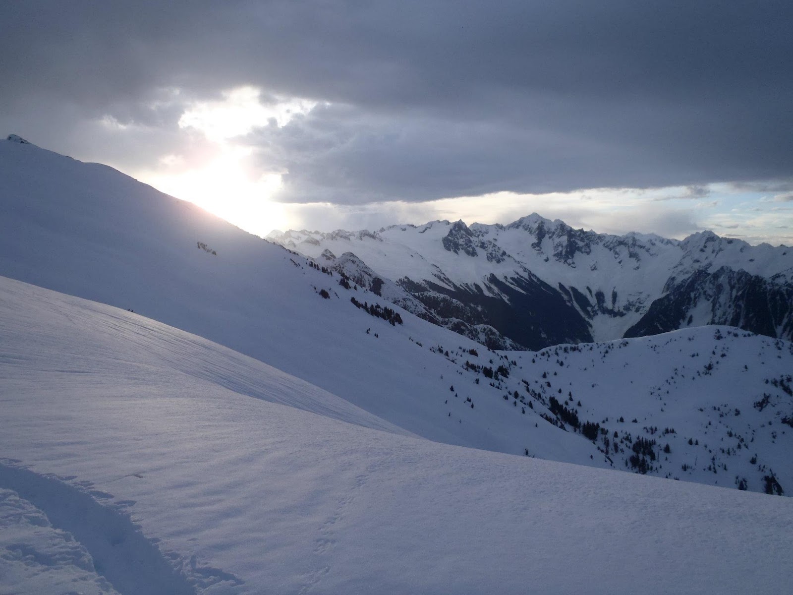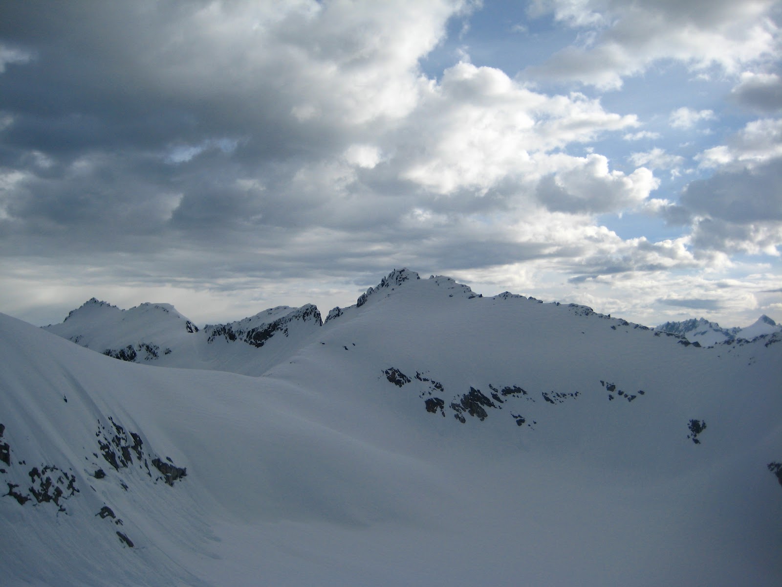 We were traversing below a rocky ridge line to begin climbing the first bowl we had skied earlier in the morning, when a cornice above let loose a point avalanche. Roaring towards us, the avy stopped just above our ski tracks. To say we were unenthusiastic by this development would be a gross understatement. There was no time for discussion, we just had to get out of there! Fast. With my heart beating out of my chest, I BOOKED IT up the hill, setting a new Kristina Land Speed record for skinning.