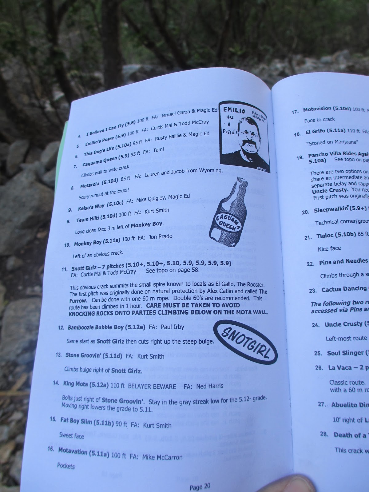 Certain routes and certain places speak to me when I climb, and I instantly fell in love with El Potrero Chico, MX, while there over Thanksgiving. The Routes have been set by two men primarily, and I had the luck of meeting Magic Ed while I was down there (and Rachel and I even made his blog!). Their consistency in naming routes is apparent, as they all seem to have the same “theme”, although what that theme is exactly I can’t really say. I can tell you I loved all of the routes there, and was happy to cap the trip off with my first ever lead of a 10c! More on that in a later blog.