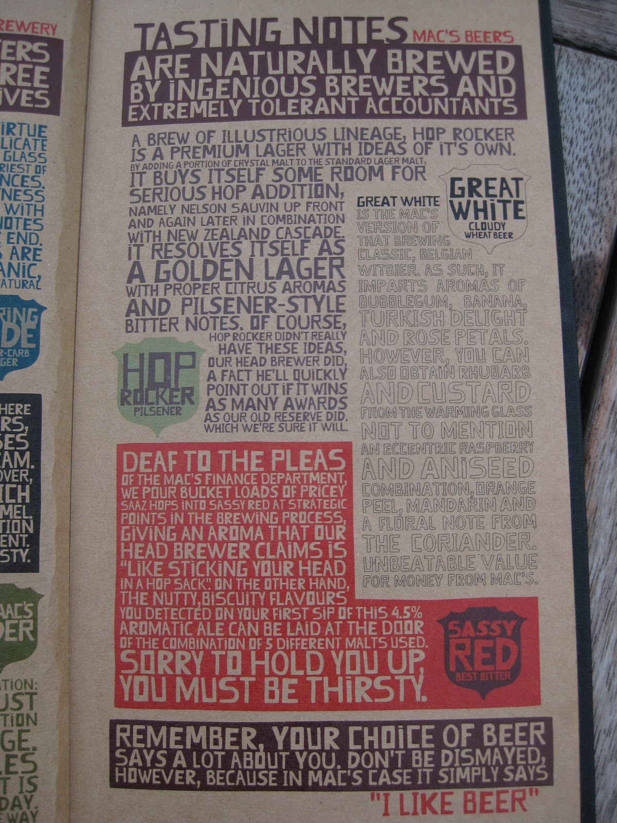 Not only were their beer’s delicious, but the people at Mac’s strive to make drinking an enjoyable experience. They write hilarious descriptions for each of their beers, and even have the pitcher’s labeled to maximise amusement.
