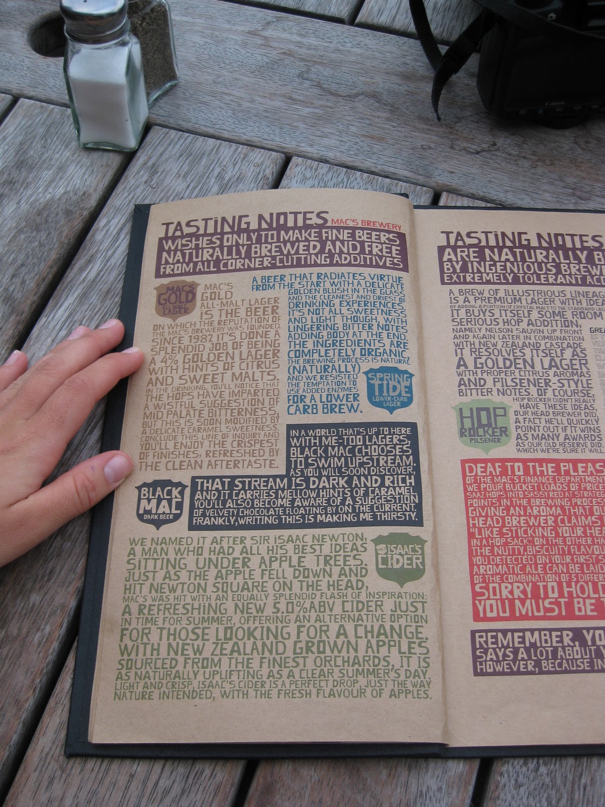 Here are some shots from inside the Brewery in Auckland, where they have famous pro-drinking quotes written on their brewing casks. I’ve also posted pictures of the beer menu from Wellington. If you have time, open the pictures in a larger screen and read the descriptions. Pretty hilarious!