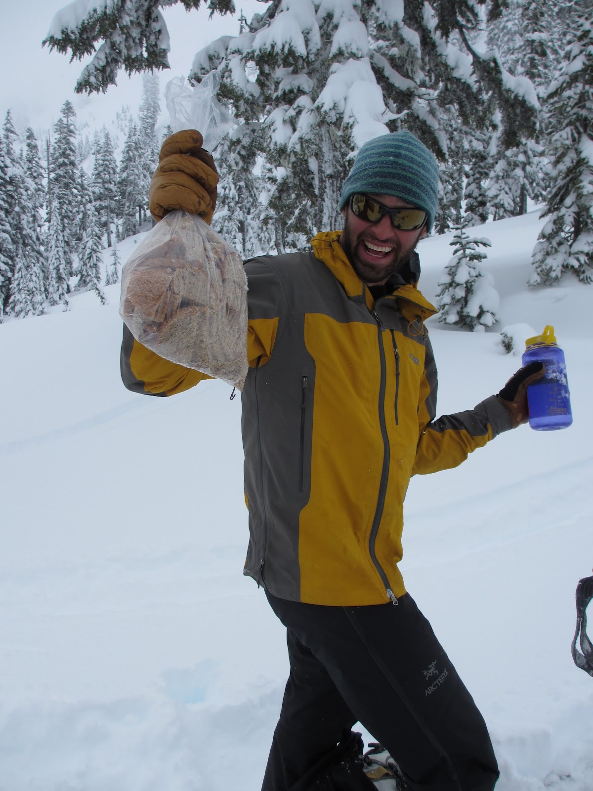 The 2nd day of our ski adventure started with a bang when I forgot lunch at the condo. Never fear, that’s why you keep a bag of stale bread in the car! We skinned up, took a run down, and stopped for “lunch”.
