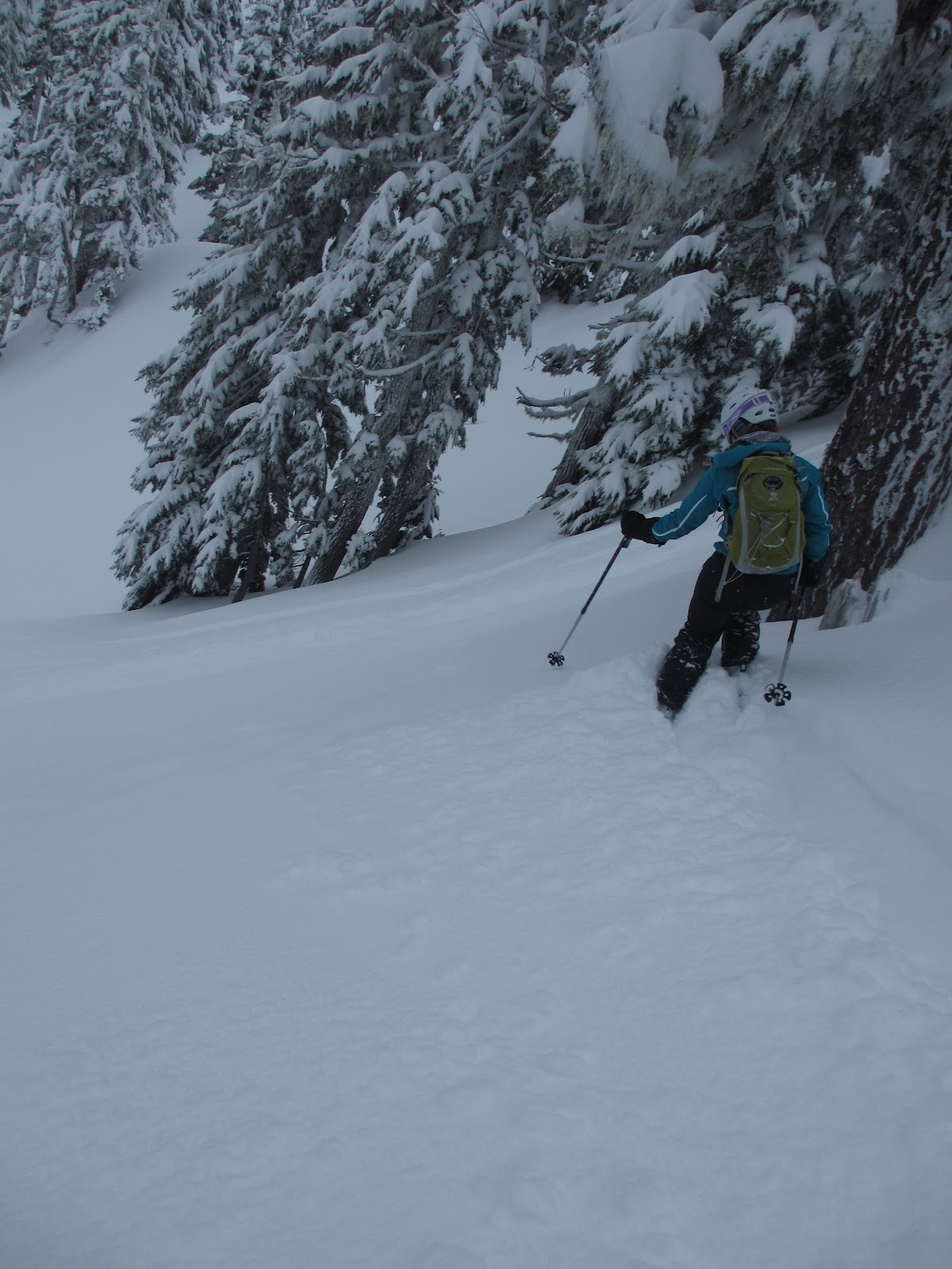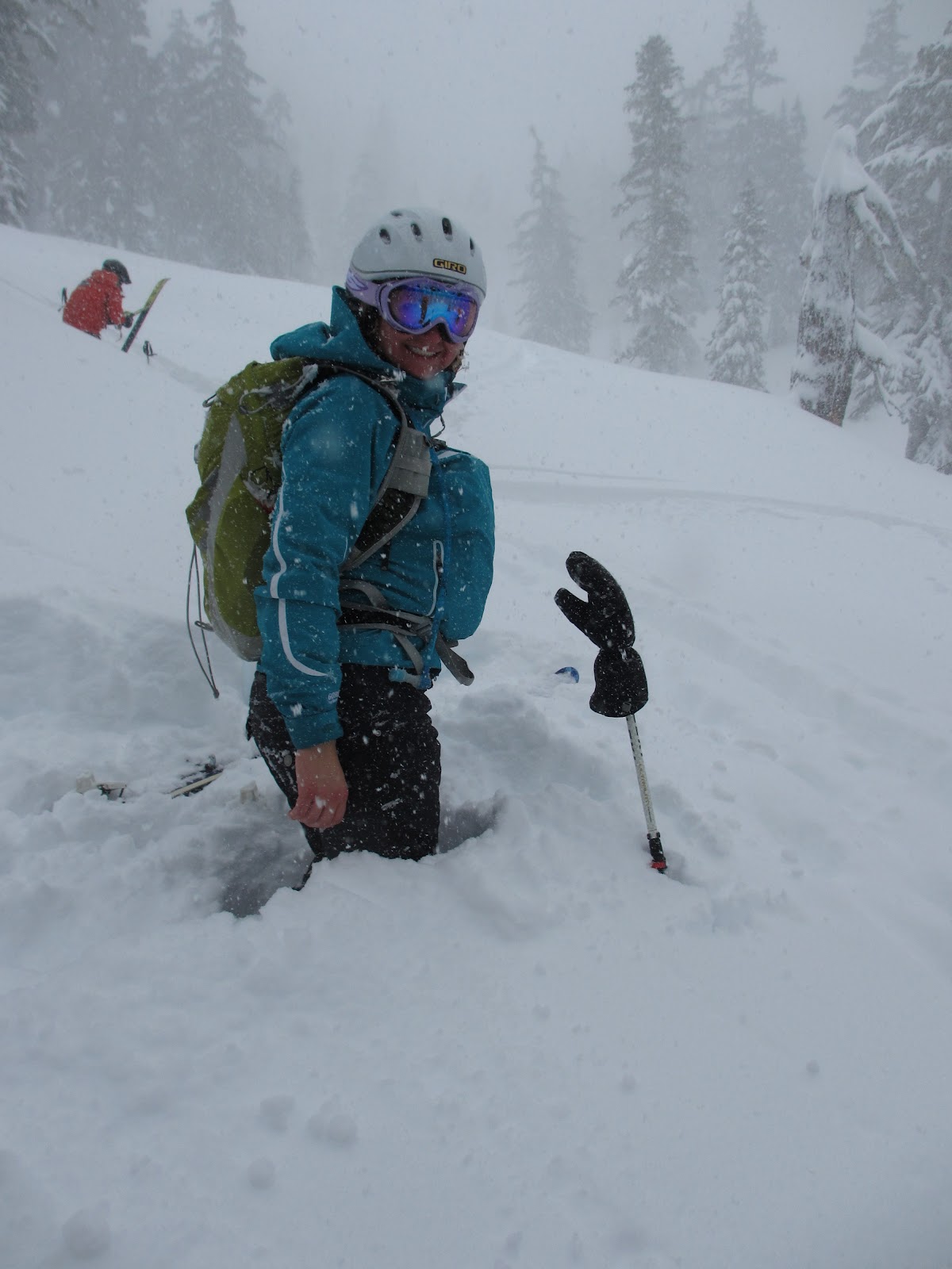 What did I learn my first day?! How to put on skins (you store them in your jacket when you are making laps, thus the “square” look to my jacket pictured above), how my new bindings functioned, how to track a beacon, and how to NOT layer your clothes. You get pretty hot skinning up a mountain it turns out, and you have to save room in your pack for those discarded layers. Who knew?