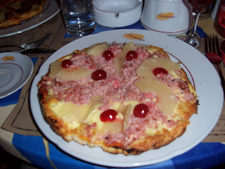 I got a very tasty pizza. It was just ham and pineapple, but as you can see the ham was candied and it also had candied cherries on it. But after all that traveling i was so hungry it could have had candied bark and I would have eaten it!