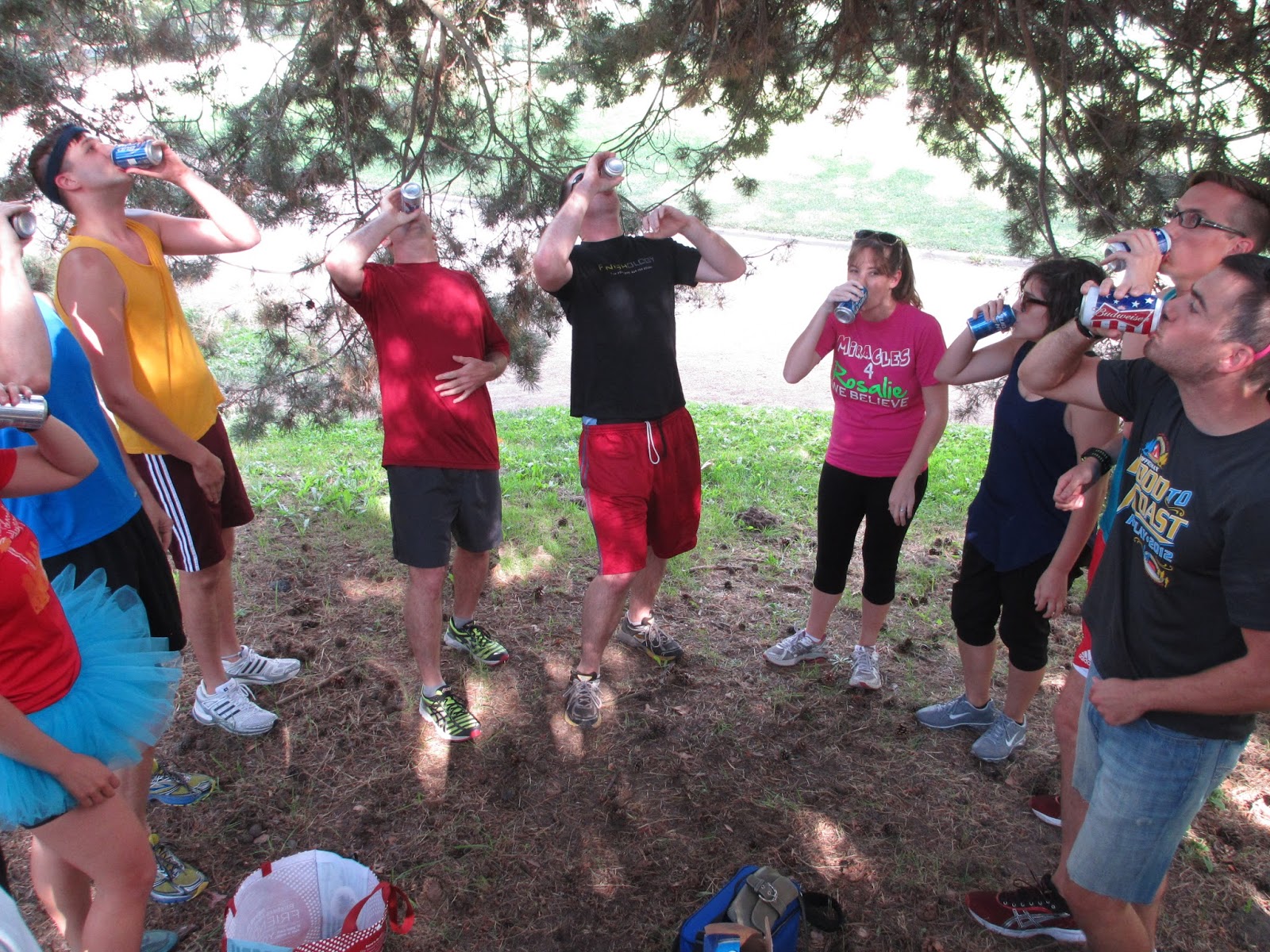 Oh, and a huge congrats to our winner Kevin, who finished in 9:23! An honorable mention goes to Jason and Brian, who fought hard for 2nd (Jason ultimately won out when Brian lost time with his near-vomiting), finishing in close succession around the 10 minute mark! All of the standout performances received commemorative tank tops (as this was Adam’s 4th Annual Birthday Beer Mile). Looking forward to watching from the stands next year!