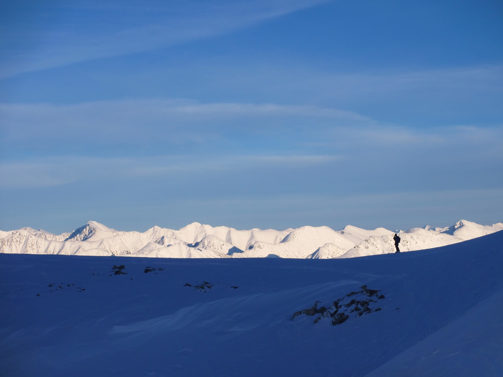 We bottomed out and skinned back up to the Col, where we were greeted with more wintry views, and enjoyed another 2,000′ decent back to the hut. Great day.