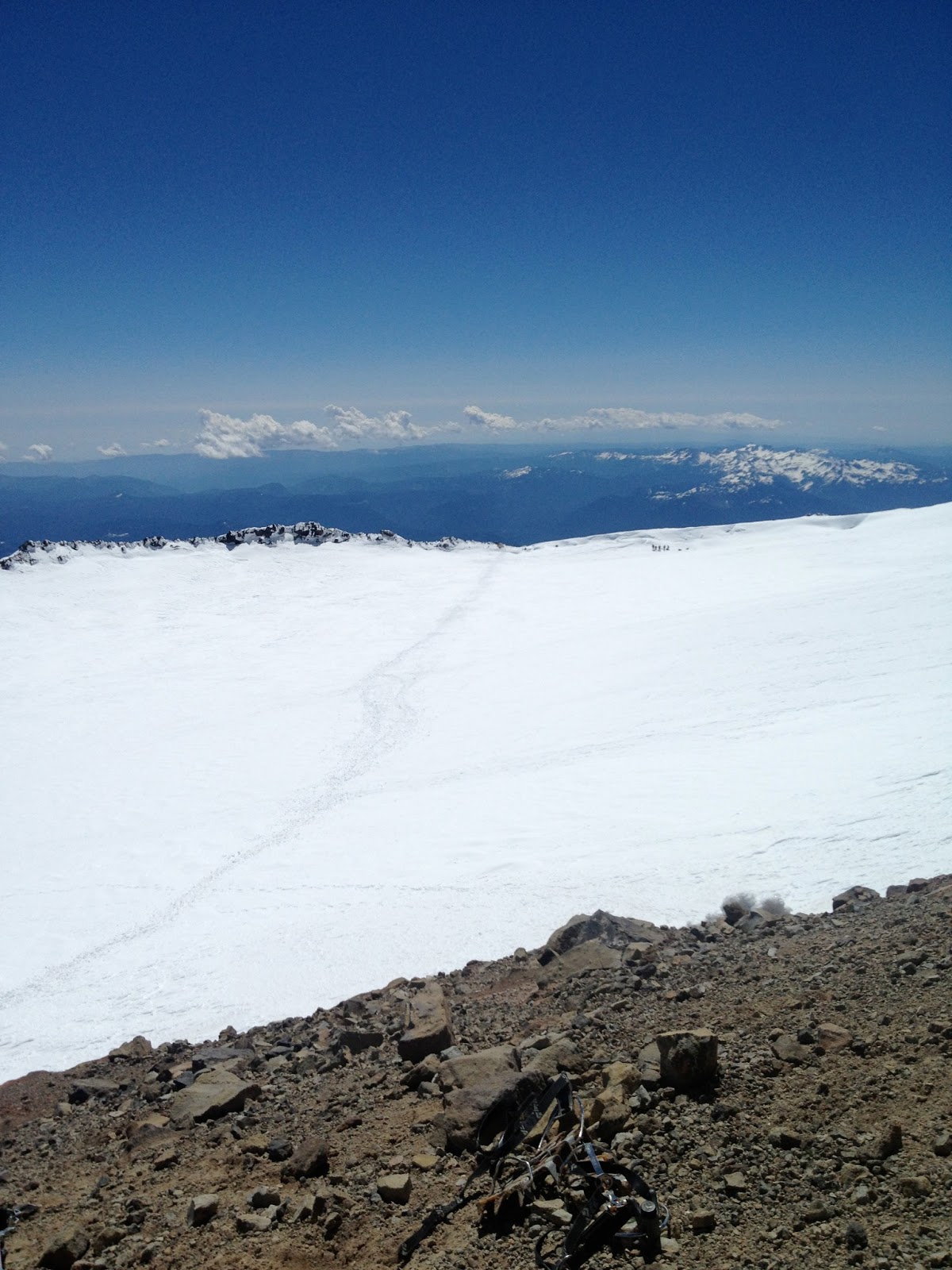 We stood on the true summit for less than 5 minutes. We split a Rainier beer, took pictures of other parties (who had also brought Rainiers to the top – duh!), and tried to enjoy the view. You could see all of the volcanoes: Baker, Glacier, Adams, Helen’s, and Hood. Shucksan and Stewart looked pretty darn beautiful as well. I tried to take summit photos but my camera jammed and my iPhone died, so I took a few eyeball panoramas and locked those up for safe keeping in my brain box.