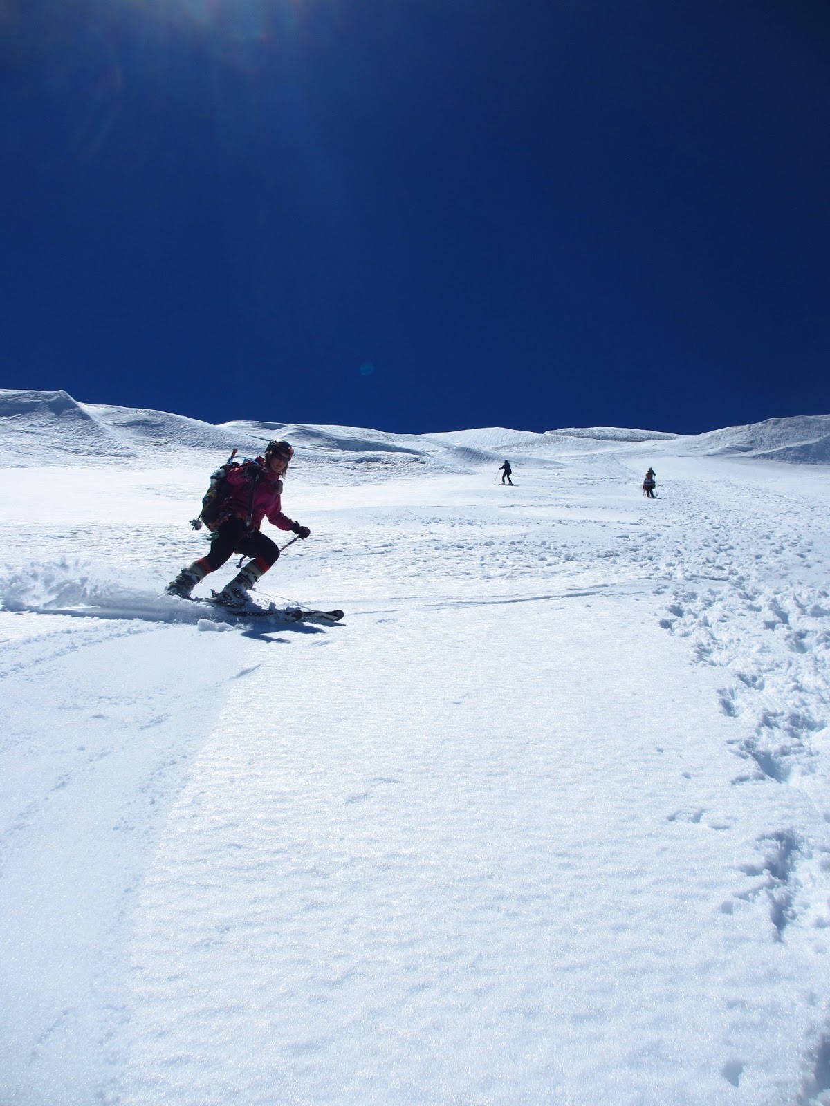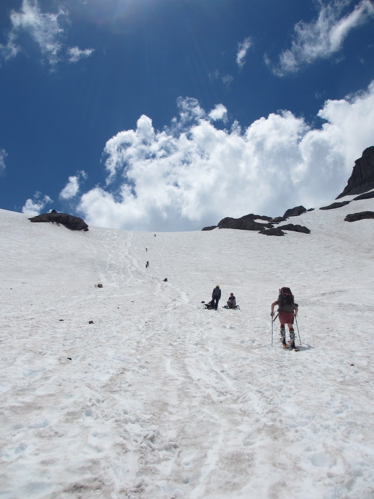 Invigorated by the sunshine, we put our sunglasses on at 5am. After a quick food and blue bag break (not necessarily in that order) we were back at it. Conditions were good for bootpacking with crampons so that’s what we did. With the warm temps we were concerned about a slushy slog, but in general everything froze and was well consolidated over night. We never once put our skis on for skinning – should have left those skins and ski crampons at camp!