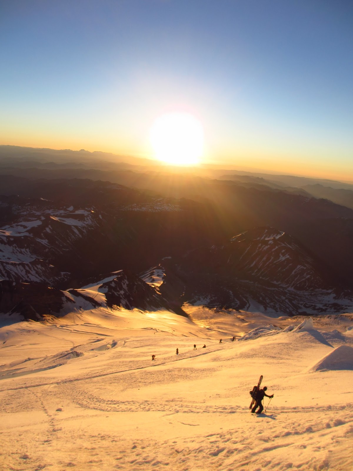 After what felt like sleeping for both an eternity and only a moment, we arose to calm, clear skies. The weather report had been calling for thunderstorms, so we were all pretty surprised (STOKED!) to see so many stars in the sky. With our skis on packs, ice-axes in hand, and climbing harnesses secured, we left camp about 3:20am to start the climb.