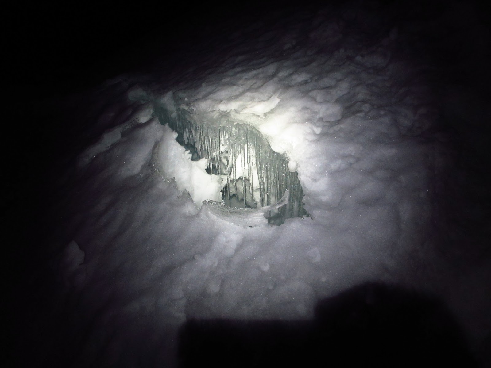 | Our first crevasse encounter filled with icicles, lit by headlamp |