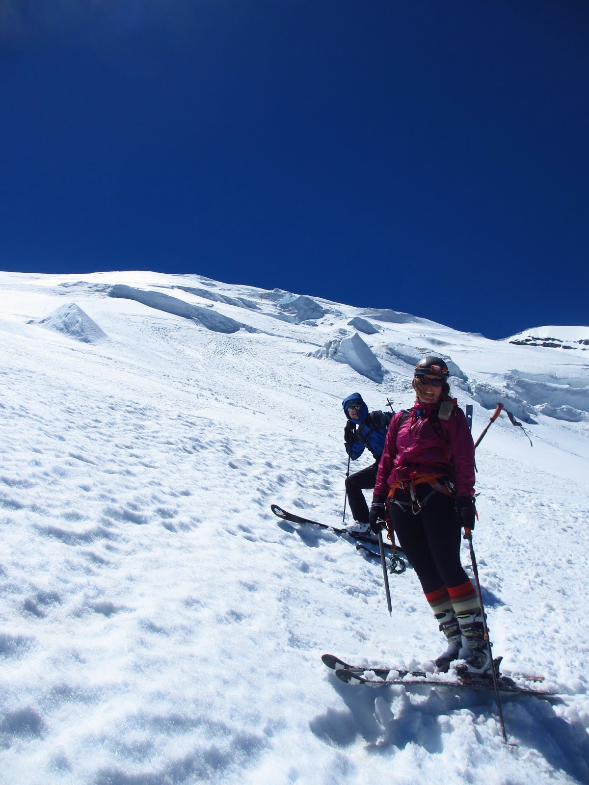 Overall the snow quality was fair. It’s was a 9,000′ run – what can you really expect?!? After negotiating the icy section at top, we found 800′ of really good turns before it turn to mush. At the snow bridge we removed skis and once again used the rope to belay each other across to safety. Then it was pretty straight forward all the way back to camp. In all, it took 2 hours to decend.