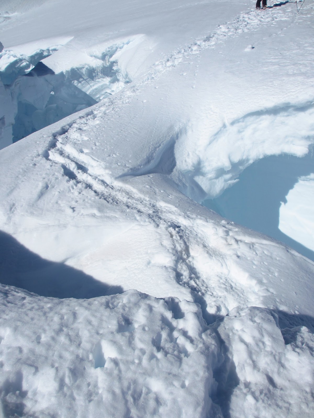 Overall the route was in really great shape too. The boot track crossed a few little crevasses, but nothing you couldn’t just step over. Then, about 12,000 feet, we encountered our first and only snow bridge. I regret the picture doesn’t do it justice. This bridge spanned across a massive, gaping hole in the mountain and off to the climber’s right side you could see down into the deep blue abyss below. It was breathtaking. That, or I was out of breath from altitude….And fear.