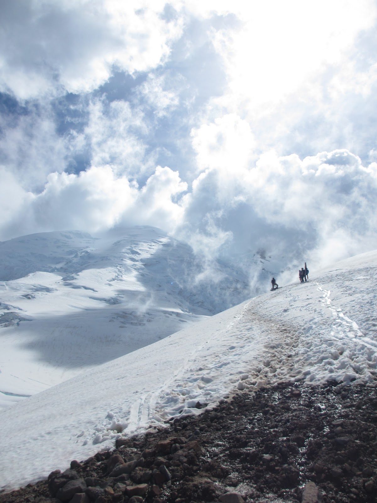 At 12,400′, on a steep section above the snow bridge we encountered our first climbers coming back from the summit. This was like a shot of adrenaline. “If people are coming down, we must be getting close!” I thought. Well, it was partially true, we were getting close, but those last 2,000′ on Rainier are no joke, and we were in for some struggles ahead.