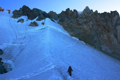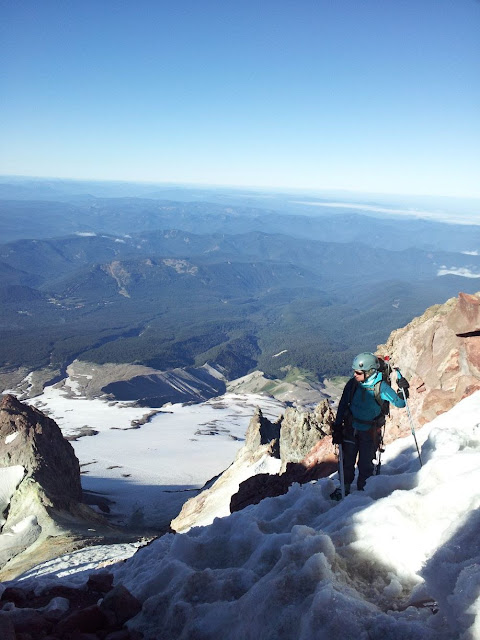 We reached the Hogsback and could see the open bergschrund (a hanging crevasse). The standard Pearly Gates route was completely dry and absolutely a no-go. We opted to instead take the next most direct route and climbed the west chute/old route to the summit ridge. The climbing conditions were quite pleasant with the sun-cups forming an almost staircase up the chutes. An ice axe was a must, and I was happy to have my whippet as well. The chutes are close to 55 degrees at the top.