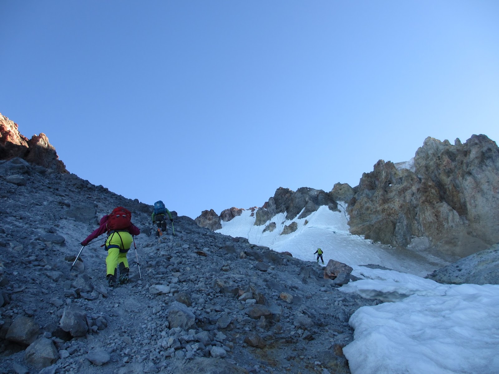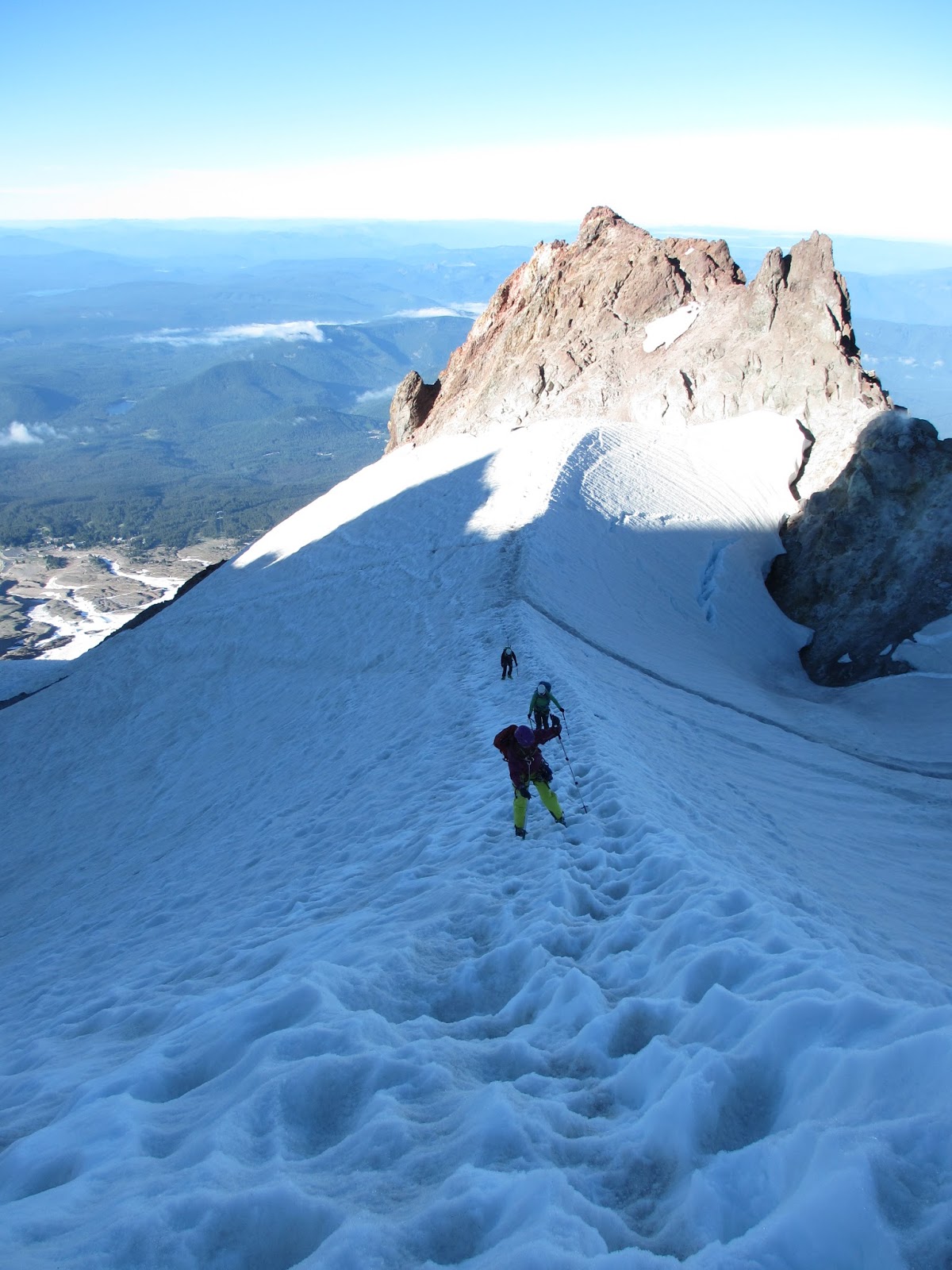 We reached the Hogsback and could see the open bergschrund (a hanging crevasse). The standard Pearly Gates route was completely dry and absolutely a no-go. We opted to instead take the next most direct route and climbed the west chute/old route to the summit ridge. The climbing conditions were quite pleasant with the sun-cups forming an almost staircase up the chutes. An ice axe was a must, and I was happy to have my whippet as well. The chutes are close to 55 degrees at the top.