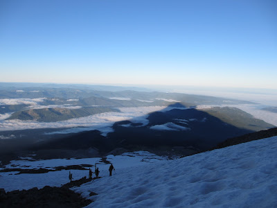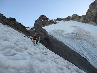 Hood will probably go for a few more weeks, but it was really, really melted out, and the sun cups were really, really terrible (and I’ve skied Muir in August!). If you head out be aware of rockfall in the late morning and afternoon. This would definitely be a hazard and was a major concern as we traversed to the Old Chute.