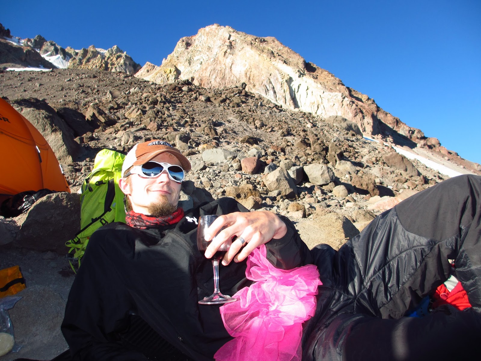 Exhausted from our big morning, we began the trek up to camp. We found what we thought to be a sheltered area on the rocks at 9,250′ and made camp. Seeing as we made it to camp by 2pm, we briefly entertained the idea of making a few laps, but decided that sun-cups are sucky and we’d rather lounge in the sun. In bathing suits. And tutus.