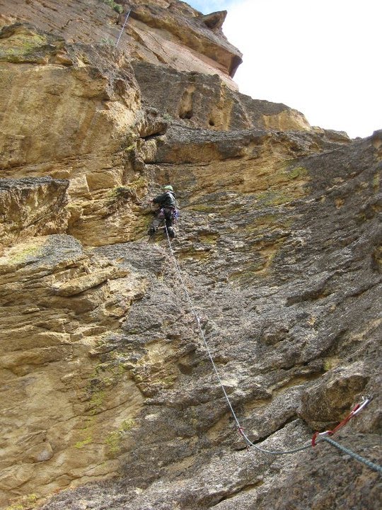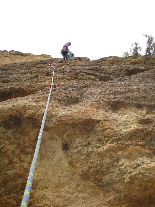 Then we swapped leads through a 5.8 (which was confusing since it wandered a bit), a 5.4 traverse (my first traverse lead – it’s a weird sensation to have rope drag feel like it’s pulling you off), a and 5.9 to top out.
