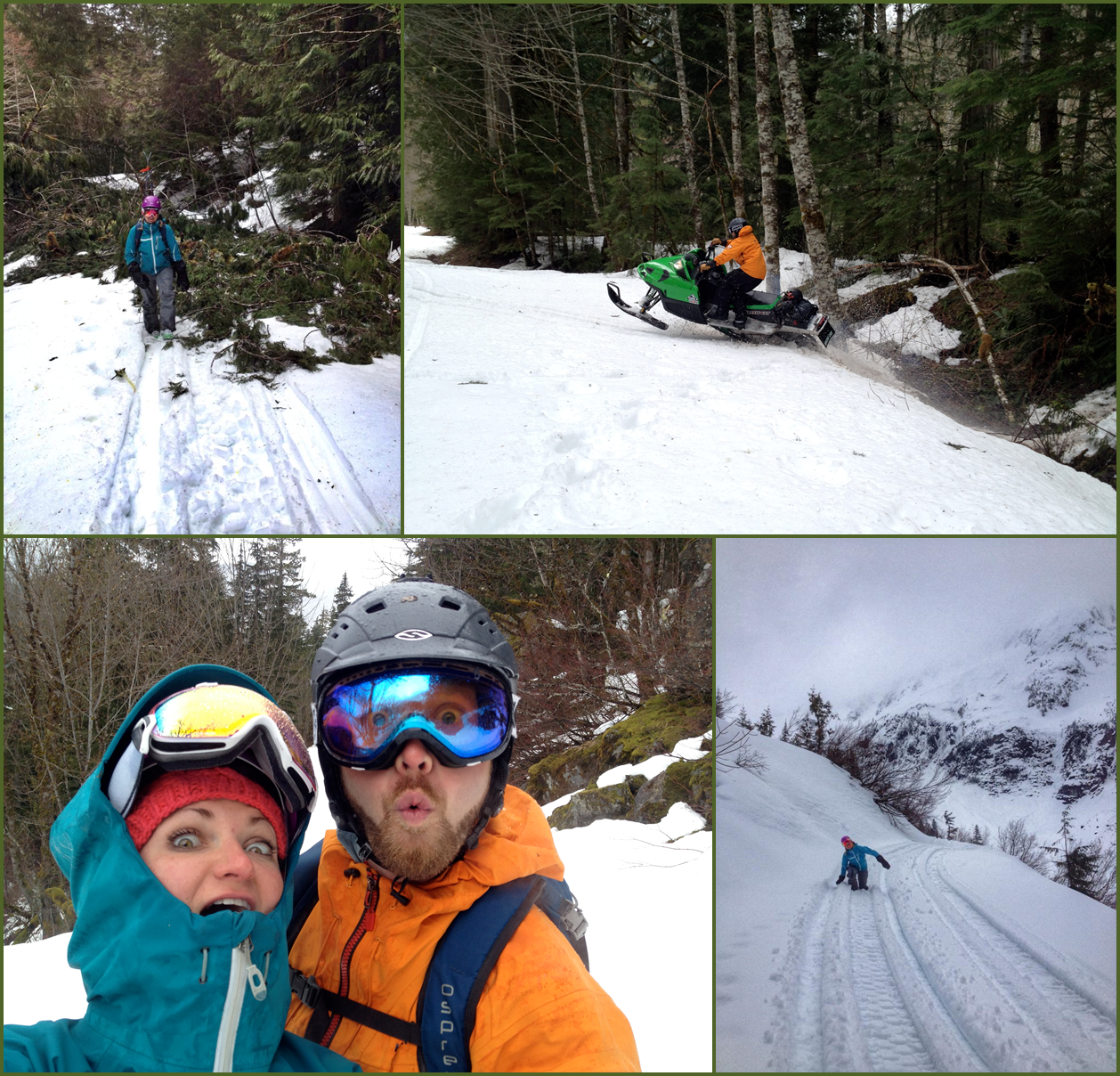 First, I tried my first attempt at snowmobile backcountry skiing with my friend Nick. We had a big objective and knew it’d be tough to hit in the right weather window, but we set out anyway. Well…..fast forward a few hours and we had left Seattle at 4am, rode a sled 10 miles through downed trees, up steep embankements, and over locked gates only to arrive at our destination and realize we were done. Conditions were too unstable and dangerous, so we watched some avalanches come down, dug under the sled to turn it around, and back down we went.