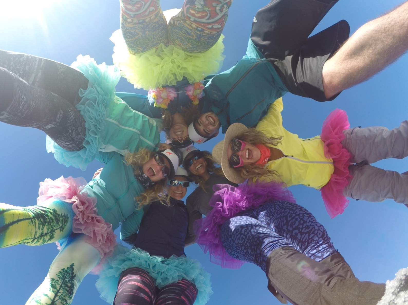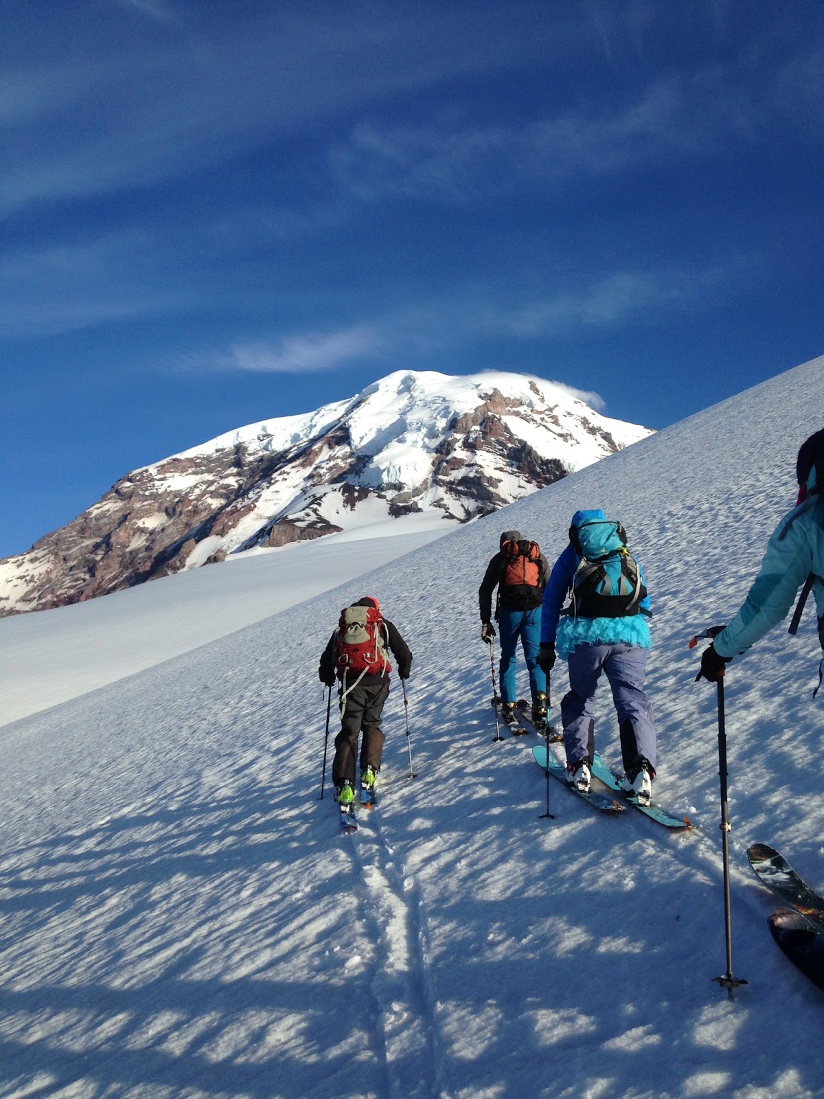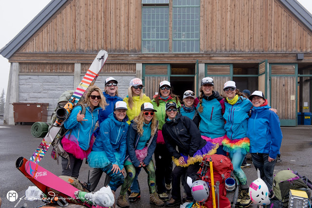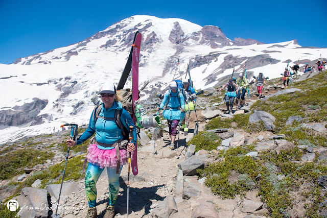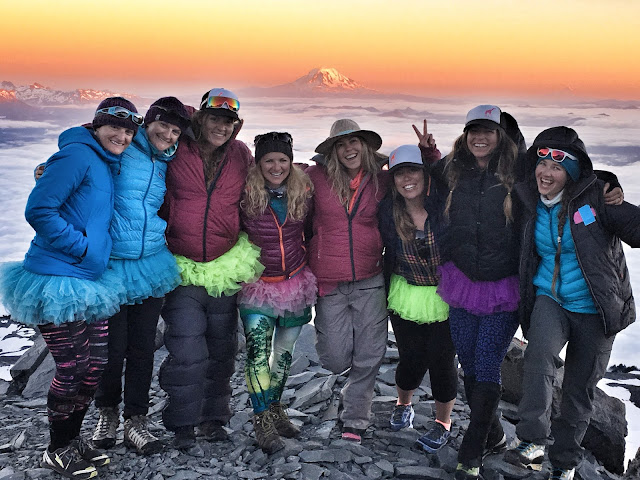 | Time for 11 neon ladies to hike out with skis. We made quite the scene, as did the other climbers coming down. |