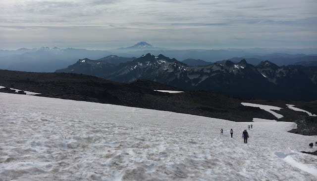 | The Muir Snowfield looking up toward the Nisqually Glacier. The snowfield was…dirty. The glacier was calving like crazy all day. |